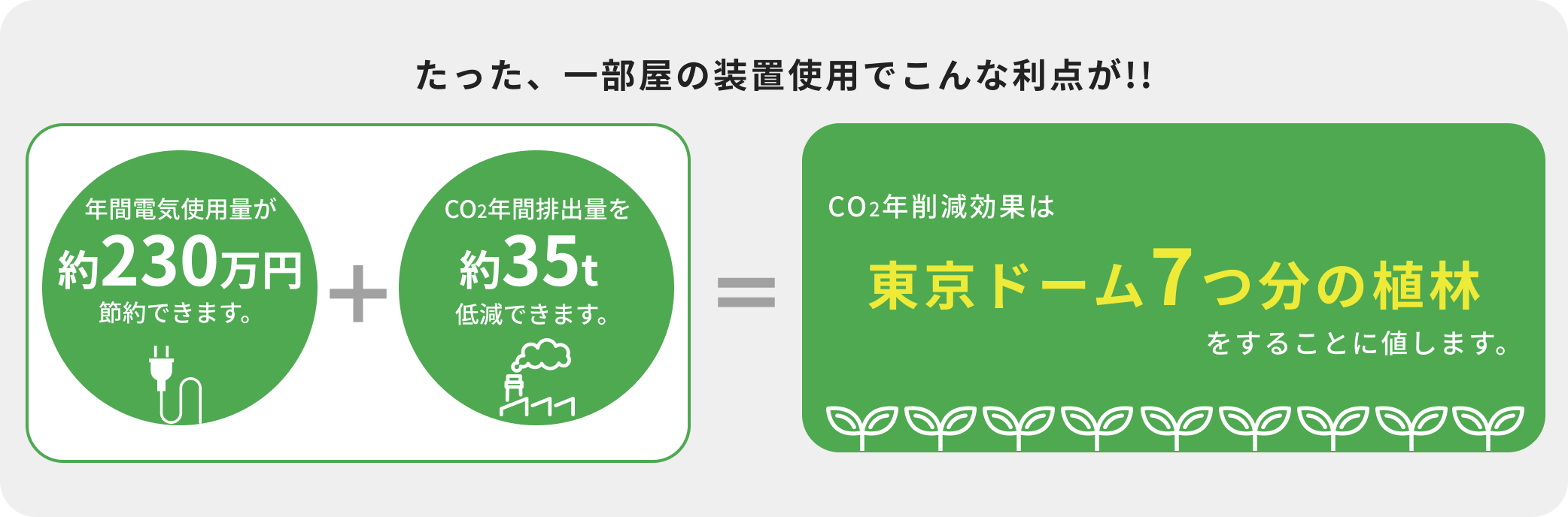 ※上記の数値は、容面積30 m²、23±1℃、50±2%RH、電力購入単価30.5 円kwh、CO2 排出係数0.452、で試算しております。